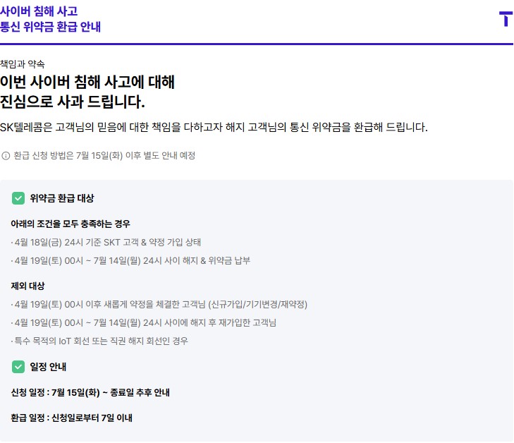 2025년 4월 발생한 해킹 사고로 인해 SK텔레콤은 고객 신뢰 회복을 위한 위약금 환급 정책을 시행하고 있습니다.
